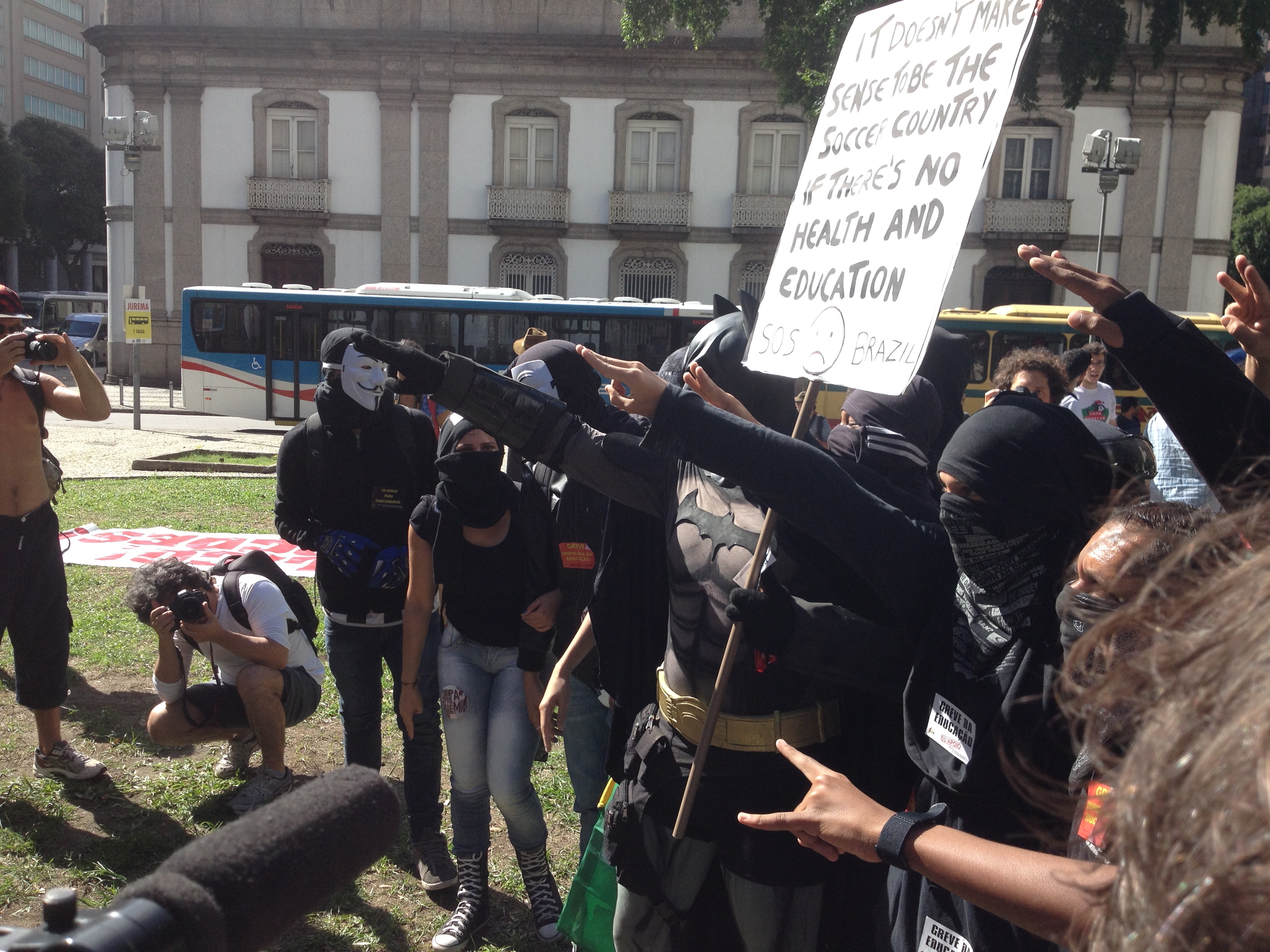 Ik kon de verleiding niet weerstaan om vanochtend vroeg met Rizza mee te gaan, de huisgenoot van Celso die zich sterk aangetrokken voelt tot de anti-WK demonstranten. Ze is een jonge journalist die bovendien aan de Fundão – de federale universiteit van Rio – studeert en net als veel studiegenoten vindt dat het WK overdreven veel gekost heeft, dat er sprake is geweest van zware corruptie, dat de FIFA een dictaat heeft doorgedrukt en dat president Dilma Rousseff is gezwicht voor het grote geld. We kwamen aan bij Candelaria, het middelpunt van de stad Rio, precies om 10 uur, de afgesproken tijd: geen kip.